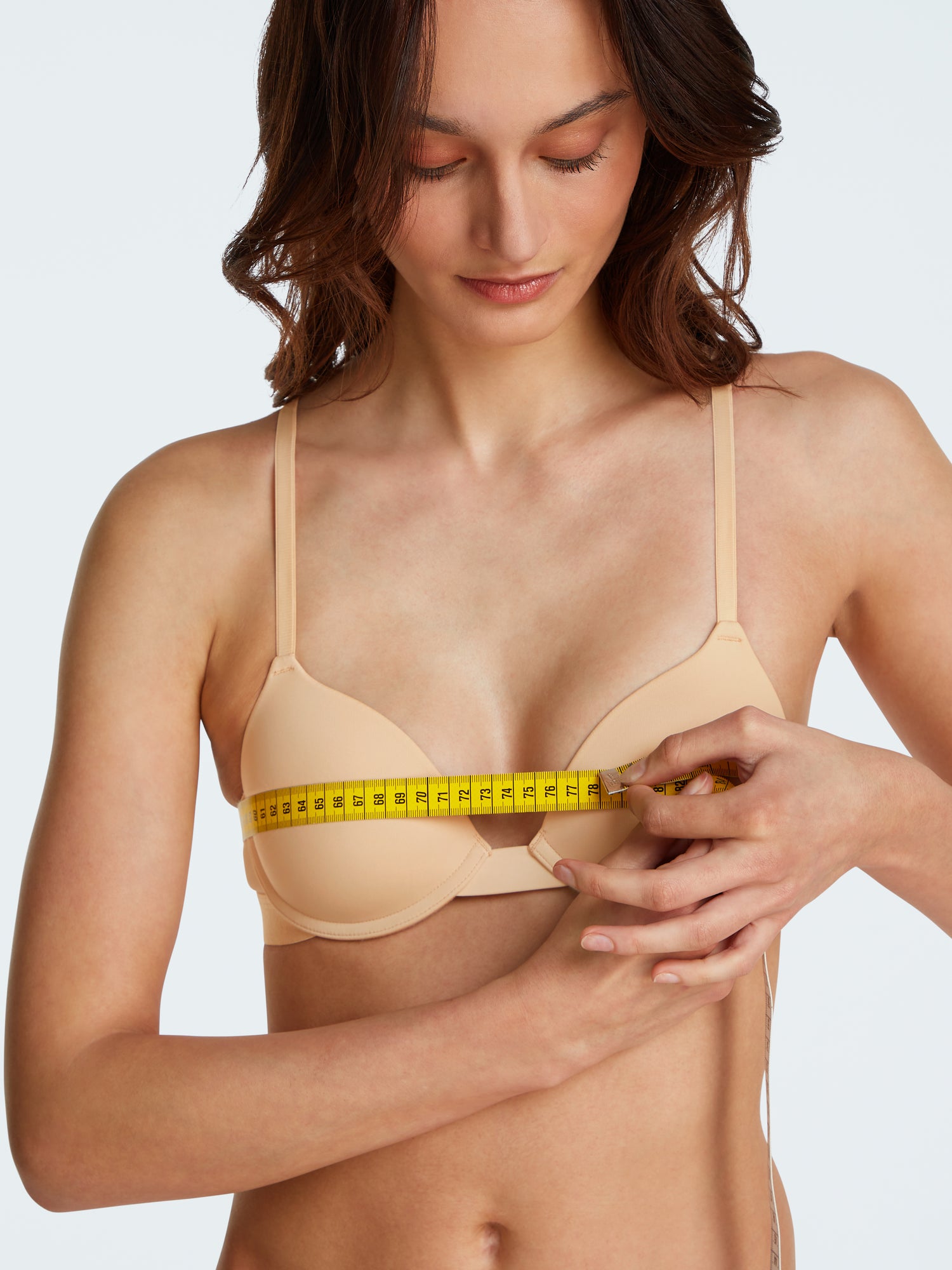 Before you start, put on a lightly lined bra — no push-ups or compression sports bras — and grab a soft measuring tape.